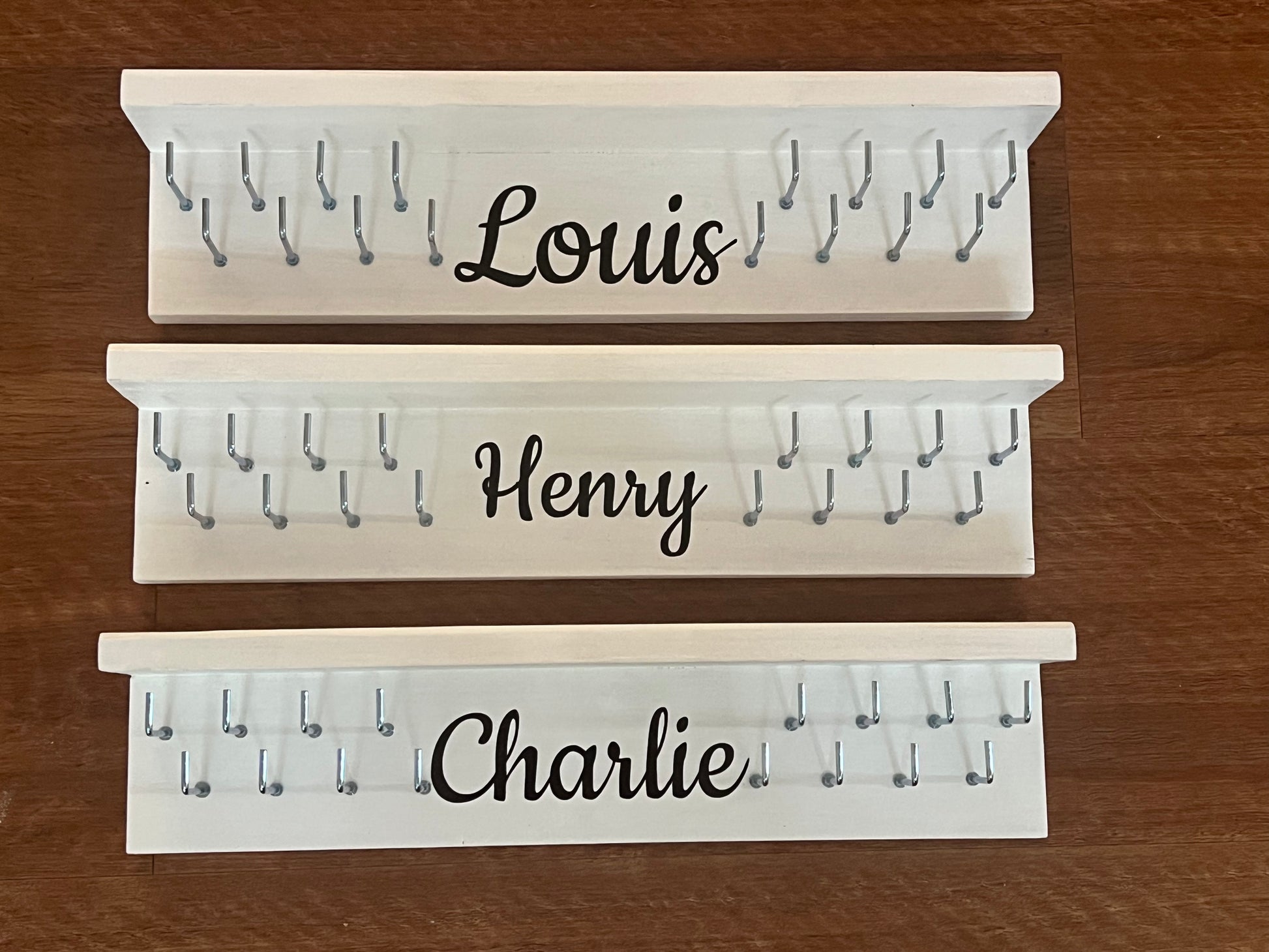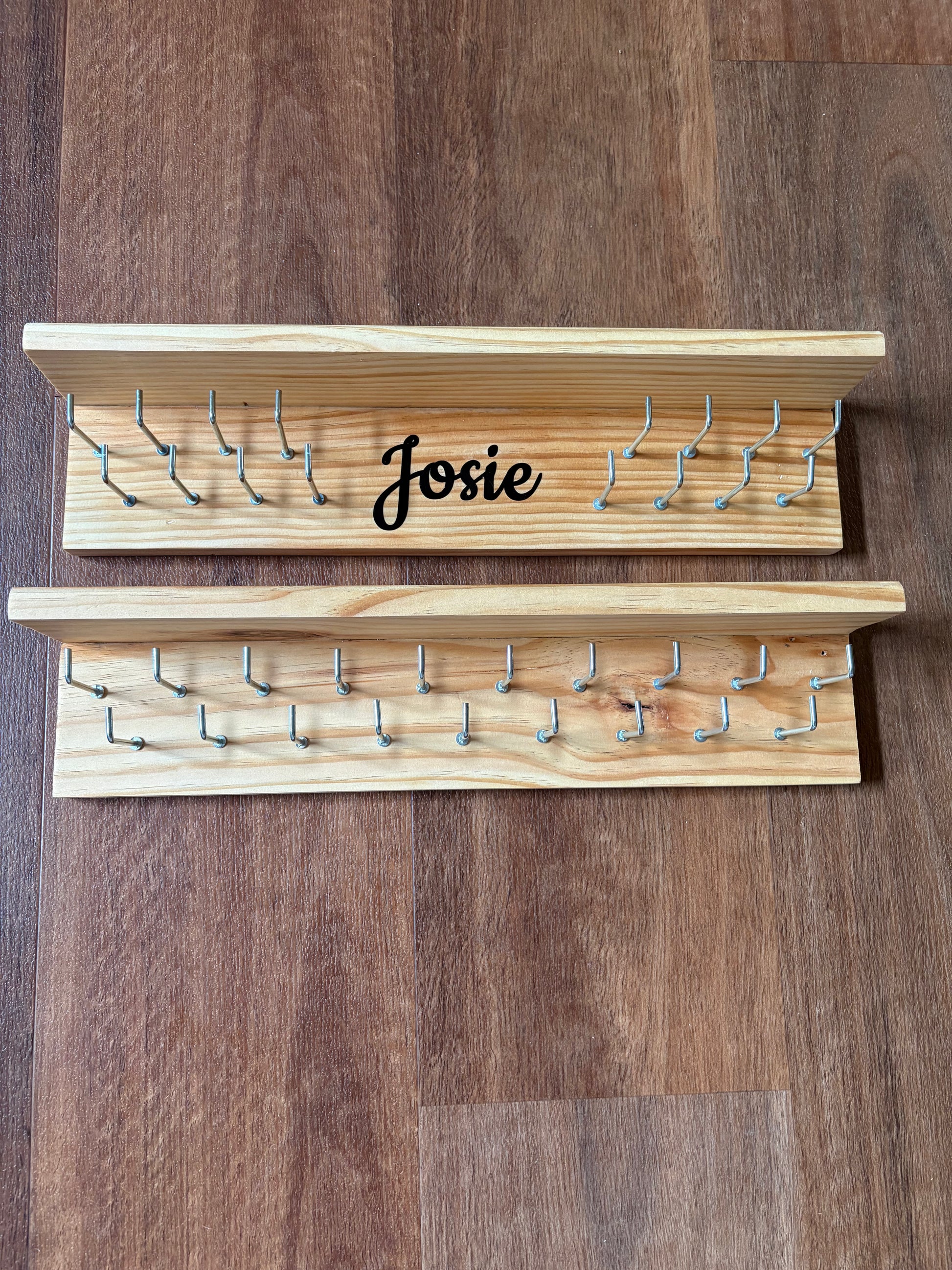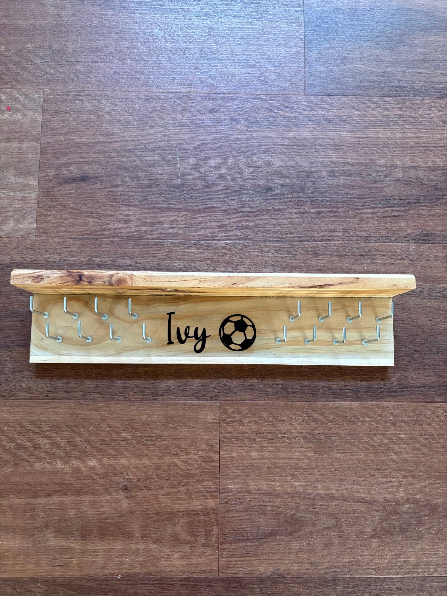 Display your hard-earned medals and trophies proudly on this beautifully crafted timber shelf. It can be personalized with the name or nickname of your athlete and comes with 16 hooks to hold plenty of medals.